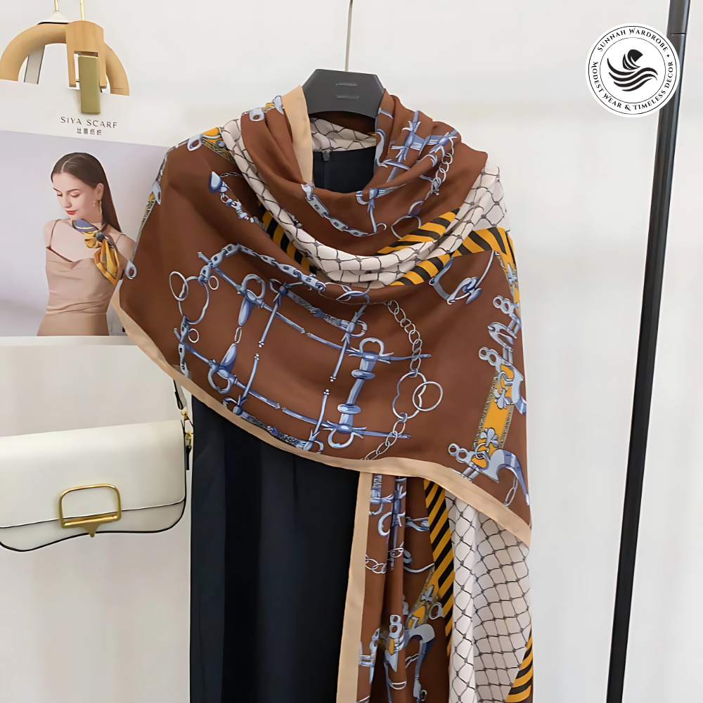 Upgrade your wardrobe with the Siya Scarf, featuring a unique brown and beige chain print design that adds a modern and sophisticated touch to any outfit. Crafted from premium lightweight fabric, this elegant hijab scarf drapes beautifully while offering breathability and comfort for all-day wear. Whether worn as a hijab, scarf, shawl, or wrap, this stylish piece is perfect for women of all ages who love a mix of luxury and versatility.
